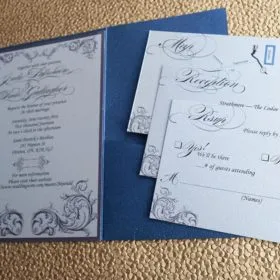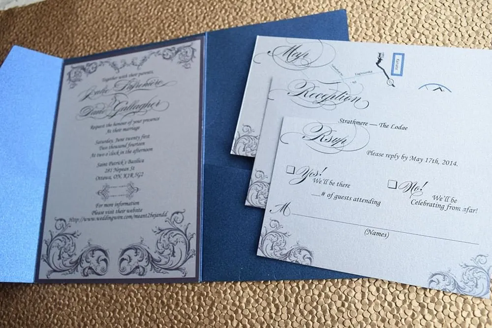 The Silver and Sapphire Wedding Invitation is a custom design with silver baroque patterns and calligraphy styled script fonts. The invite is printed on silver metallic paper and mounted in a sapphire blue metallic tri-fold pocket for the rsvp, reception and map cards.