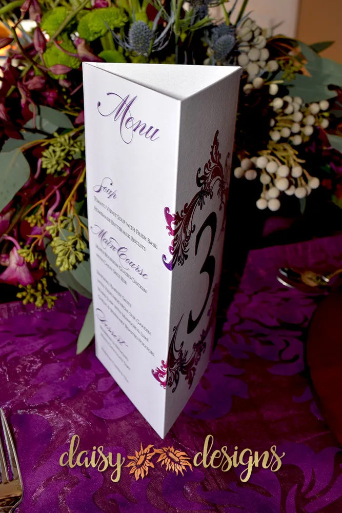 Daisy Designs has a wide assortment of custom Table Numbers that you can choose from. Some of the following are just a small sample of what we can offer you. Note the ‘Dress’ shaped items – they are individually made from a range of papers and with your choice of number font – a unique keep-sake. **Please note that frames, bottles and ‘ring’ card holders shown are not included.