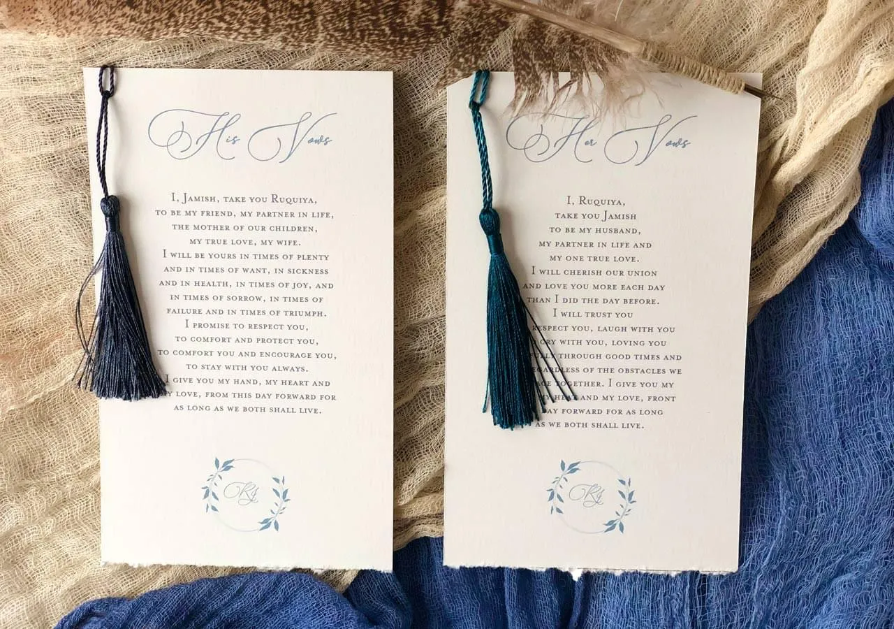 Whether you are looking for a single flat card, a folded card or additional pages, we’ve got you covered. Have your Vows printed as custom designed stationery and have a great keepsake of your special day. Add a ribbon or torn edge and make them extra-special.