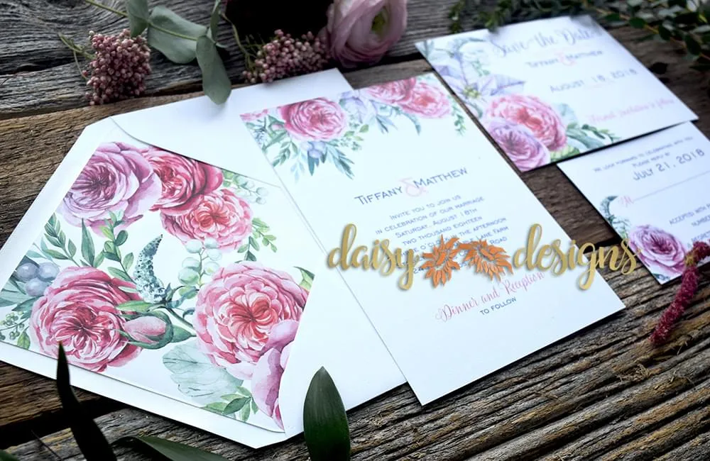 No, it’s not a spelling mistake. Our Ranunculous Wedding Invitations feature beautiful watercolour ranunculous flowers on the invite, rsvp and the optional save-the-date cards and envelope liners.