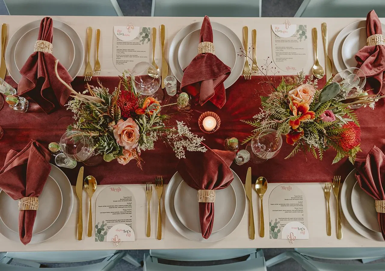 This stunning suite was created for a styled shoot at Café Palmier and featured in Today’s Bride magazine. Our design features mix and match envelopes with sage green and a dusty rose to match the arched invitations. The design continues through to day of menus and place-cards clipped with these adorable cactus clips (not included, found at local Staples store).