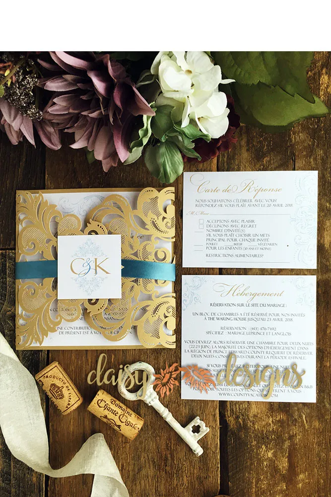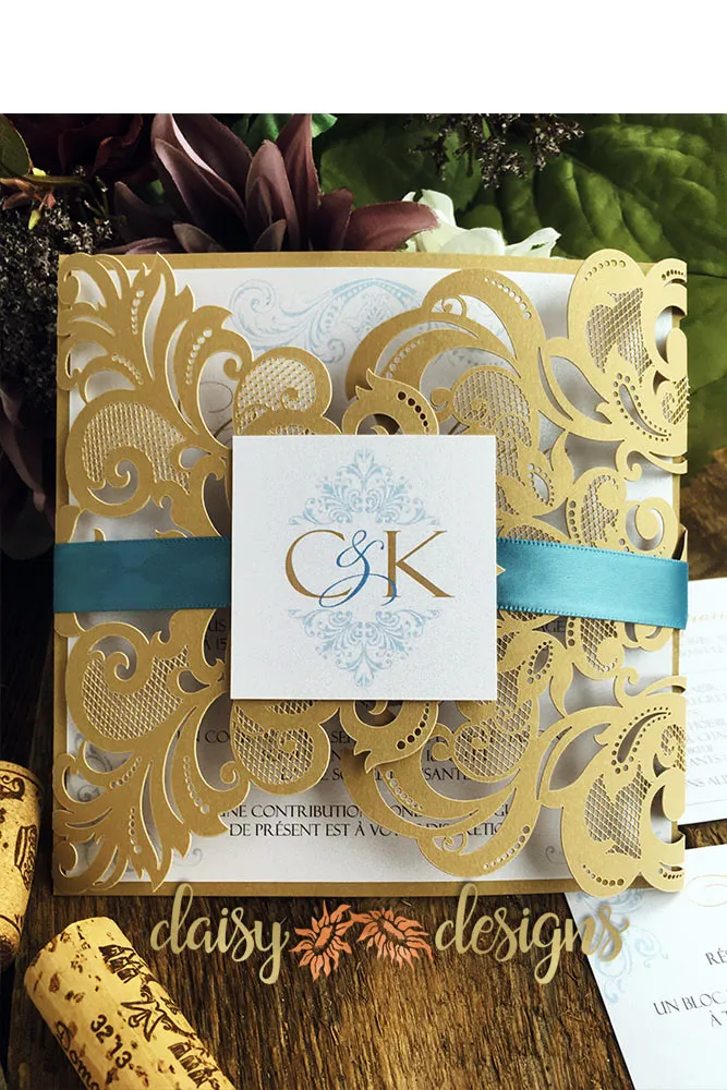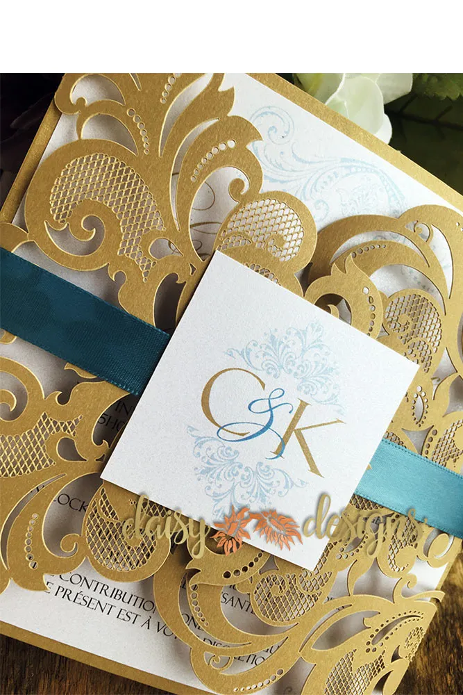 These Elegant Gold laser-cut gate-fold invitations are the ultimate in fine luxurious wedding stationery. The intricate details are simply stunning.