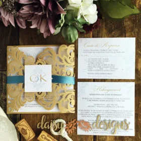 These Elegant Gold laser-cut gate-fold invitations are the ultimate in fine luxurious wedding stationery. The intricate details are simply stunning.