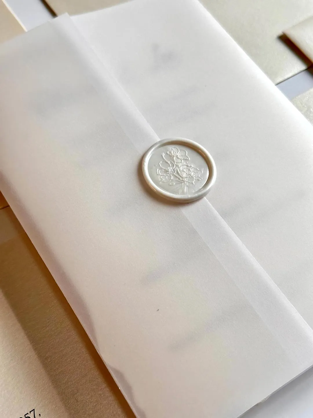 Create an ethereal and luxurious presentation with a full vellum wrap around your wedding invitation. This translucent layer adds a soft, romantic touch while elegantly encasing your invitation suite, making it an unforgettable keepsake for your guests.