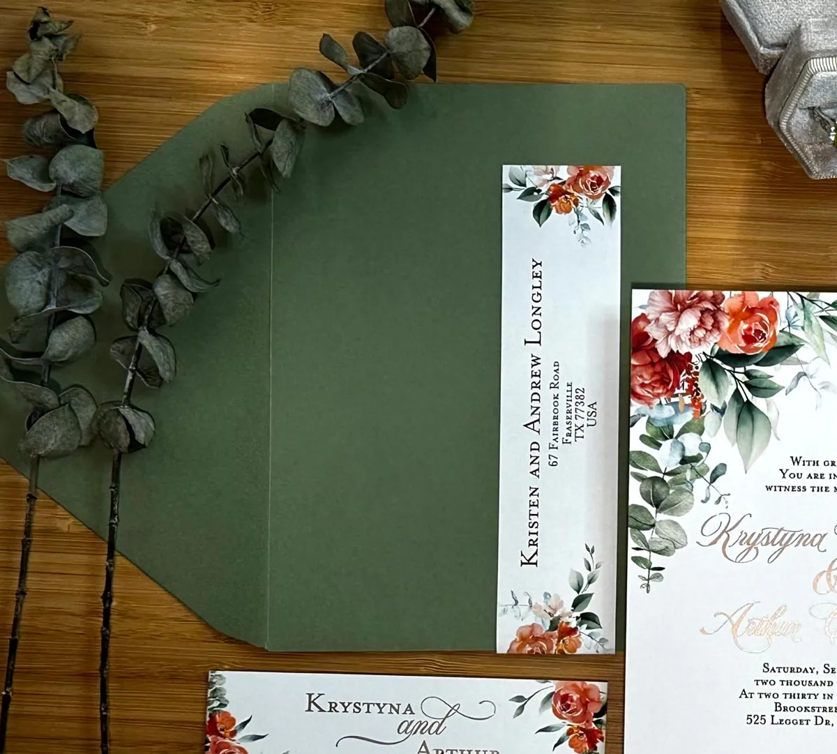 Take the stress out of addressing with custom address wraps or printed envelopes. Our wraps are designed to add a personalized and polished touch and are perfectly tailored to match your wedding theme.
