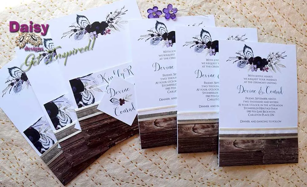 Our Bohemian Feathers Wedding Invitation suite has a fun rustic theme, with beautiful floral and feathers bouquet and a popular barn board bottom border. It is available with a back-pocket to hold other insert cards and wrapped with a matching or contrasting ribbon.